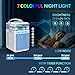 - ❄【Refrigeración tranquila y 7 colores de luz nocturna】 Este enfriador de aire portátil está diseñado por expertos y tiene un diseño único de conducto de aire con mecanismo de fluido para crear poco ruido que no molesta tu sueño. Las luces LED de 7 colores crean un ambiente cómodo y relajante para dormir que te ofrece un sueño relajante y refrescante en las noches calurosas de verano.
