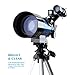 - Telescopios ultra claros de 70 mm: apertura de 70 mm con elementos ópticos de vidrio totalmente recubiertos. Este telescopio astronomico refractor garantiza una buena calidad de imagen, así como una correcta aberración cromática lateral, y puede reducir la distorsión y la distorsión cromática longitudinal. Diseño totalmente revestido para reducir la reflexión de la luz y aumentar la transmisión de la luz.