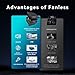 - [Fanless pasive cooling design] Z100-0dB fanless miniPCs excel in scenarios prioritizing noise reduction, reliability, low maintenance, dust-free operation, no vibration, energy efficiency, and a compact form factor. Su versatilidad hace que sea ideal para el entretenimiento en casa, establecimientos de oficina, aplicaciones industriales, y entornos altamente sensibles a la contaminación de ruido.
