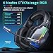 - Cuatro Modos de Iluminación RGB: Auriculares gaming hay 4 modos de modo de luz constante, modo de salto, modo de respiración y gradiente. A través del botón de control, las diferentes escenas del juego se combinan con diferentes luces de juego RGB para hacer que su entorno de juego sea más de ciencia ficción y misterioso y hacer que su experiencia de juego sea más genial y más realista.